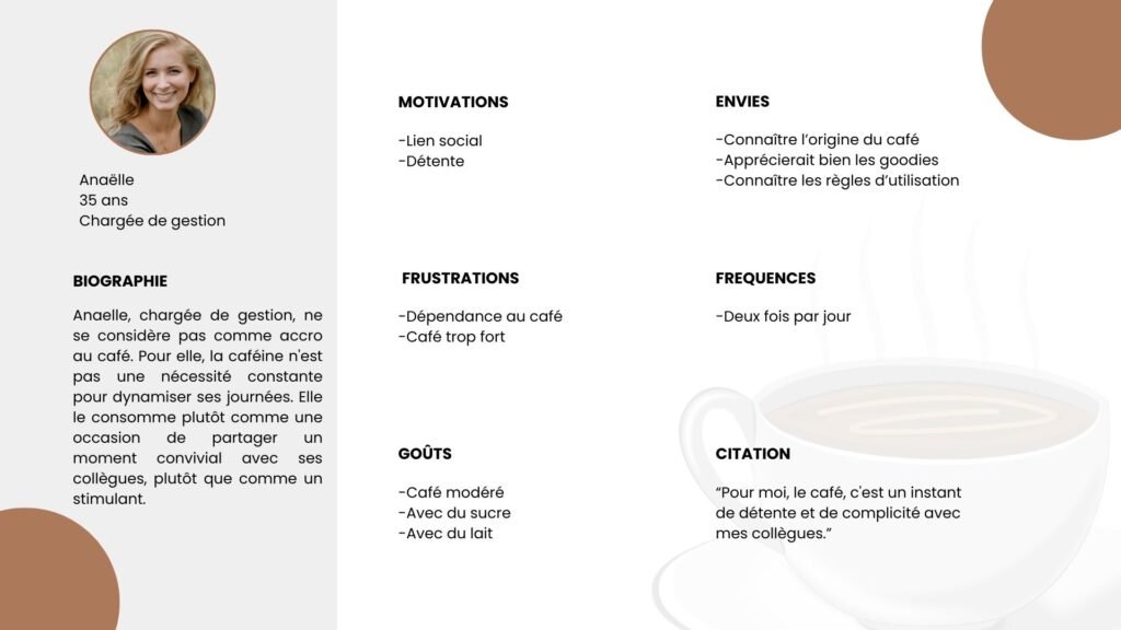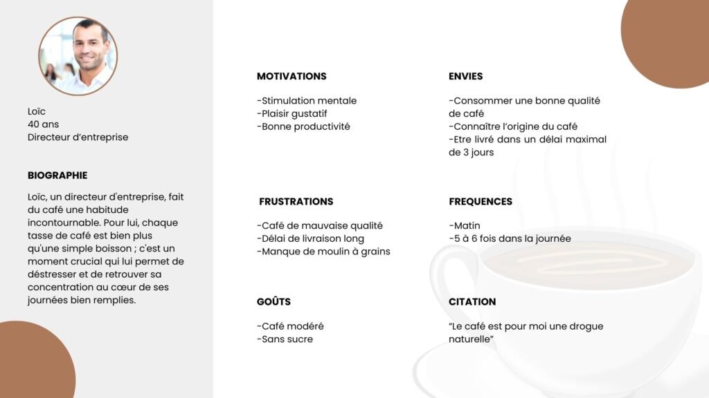 Après avoir mené des entretiens, deux profils distincts ont émergé parmi les participants. D’un côté, nous avons les aficionados du café, ceux qui le consomment à une fréquence très élevée. De l’autre côté, nous trouvons les modérés, ceux qui en consomment moins fréquemment. En m’appuyant sur ces deux profils, j’ai élaboré deux personas pour mon étude.